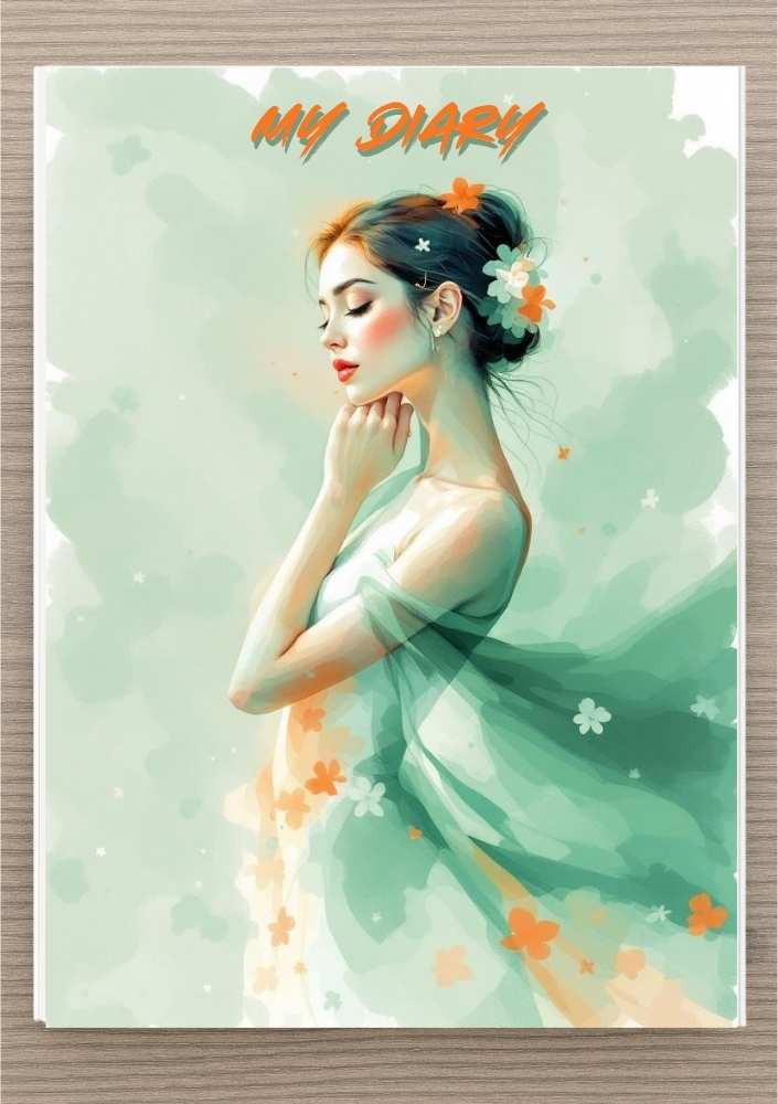 מחברת יומן קסומה עם איור צבעוני של אישה בשמלה פרחונית בגוונים ירקרקים וכתומים המשדרים רוגע ואופטימיות.